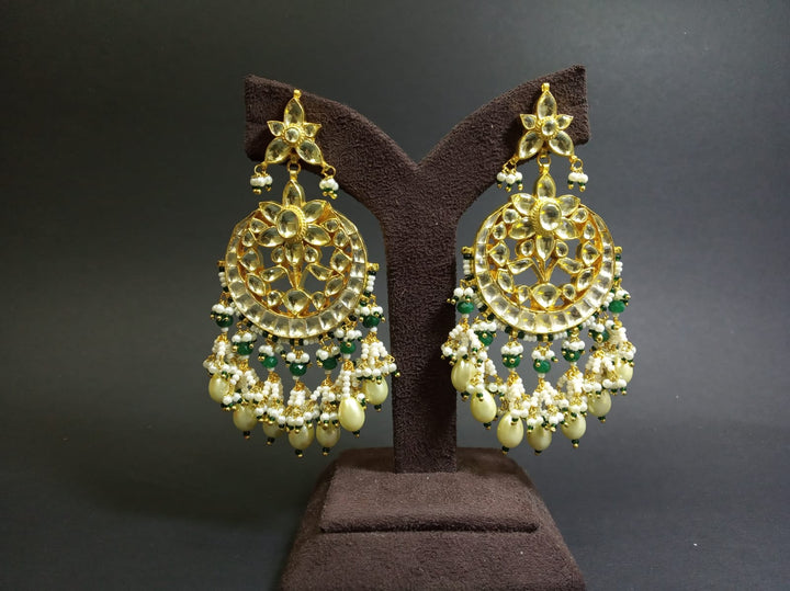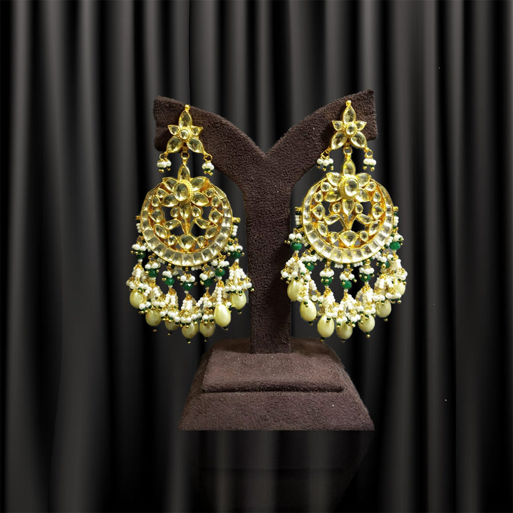 Style: Danglers Stone Setting: Paachi Kundan setting Item(s): Earrings Drop(s): Pearls; Finish: 22K Gold plated Finding: Push button