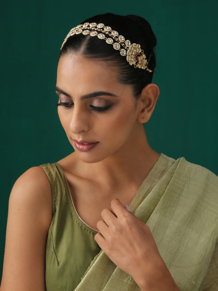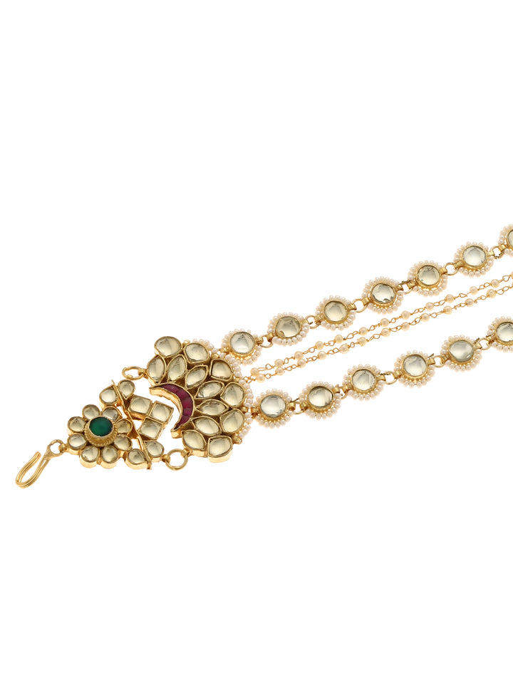 Kundan Sheeshphool is 22K Gold plated in paachi kundan setting embellished with colored kundan and pearls. This sheeshphool can be worn by bride's maid and by the bride to be for her mehendi function.