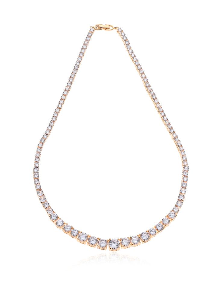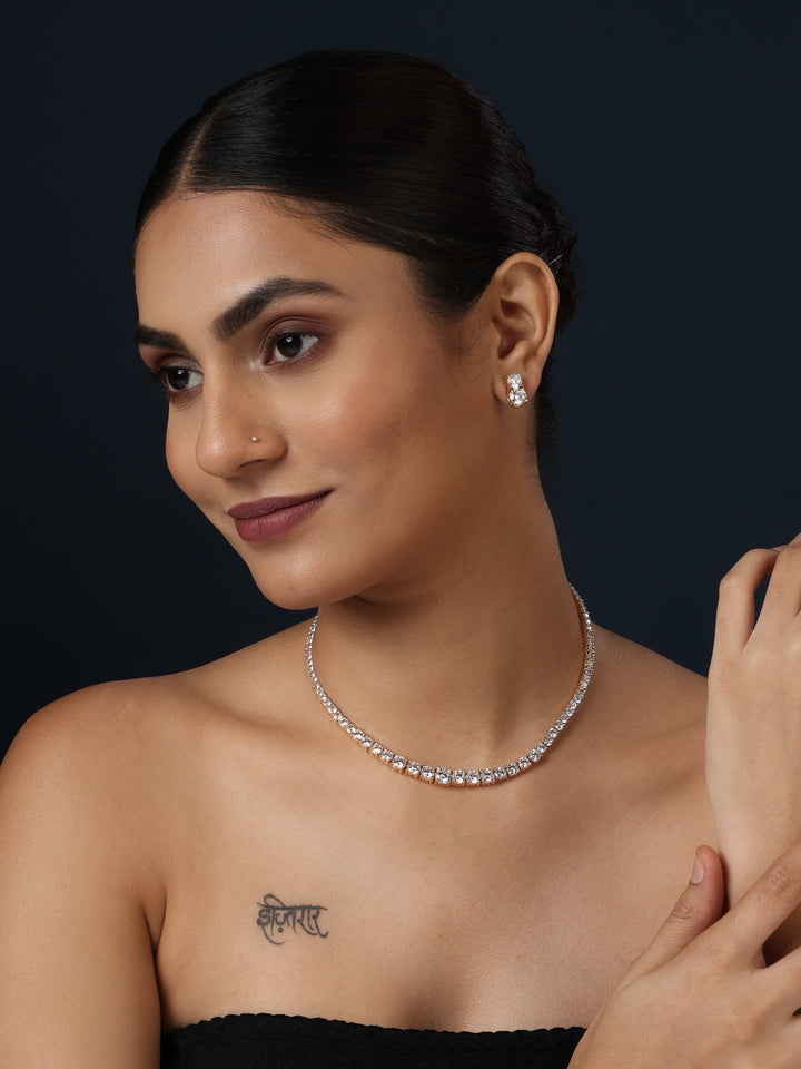 The Glacia Gold Necklace Set is white gold-plated, giving it a luxurious shine that enhances its elegant collar design. Embellished with sparkling diamond-like stones, this silver-toned set radiates sophistication and grace. Paired with matching stud earrings, it’s perfect for weddings, parties, and festive celebrations. This set adds a refined touch to any outfit, making it a timeless piece in your jewelry collection.