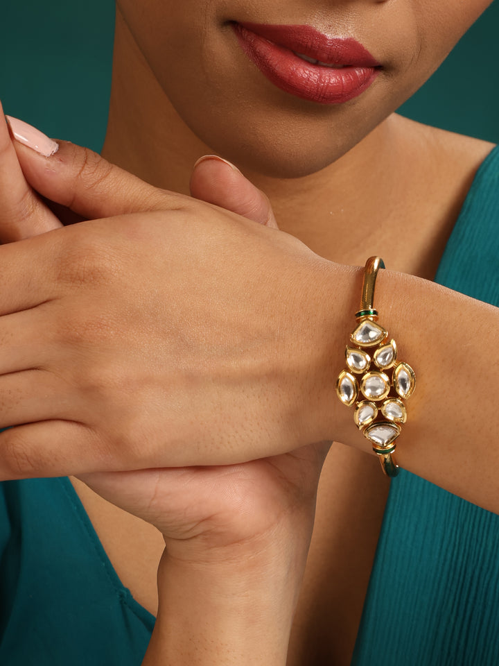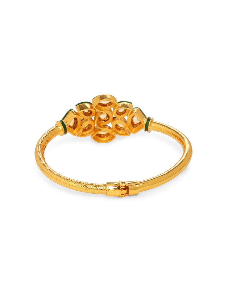 Swarna Jyoti means 'Golden Light' . This 22k gold plated bracelet with a kundan setting reflects the pure and radiant essence of golden light, perfect for adding a touch of splendor to any ensemble.