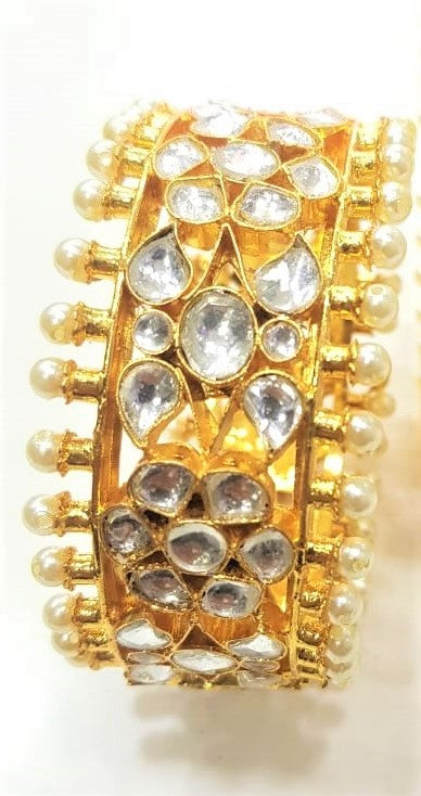 Kundan Kada is 22K Gold plated in Pachi Kundan and is embellished with Pearls. This magnificent pair of kadas makes you look royal. They are easy to wear as they are openable by screw. These can be worn by the bride and brides family to get that extra-ordinary look on the special day.