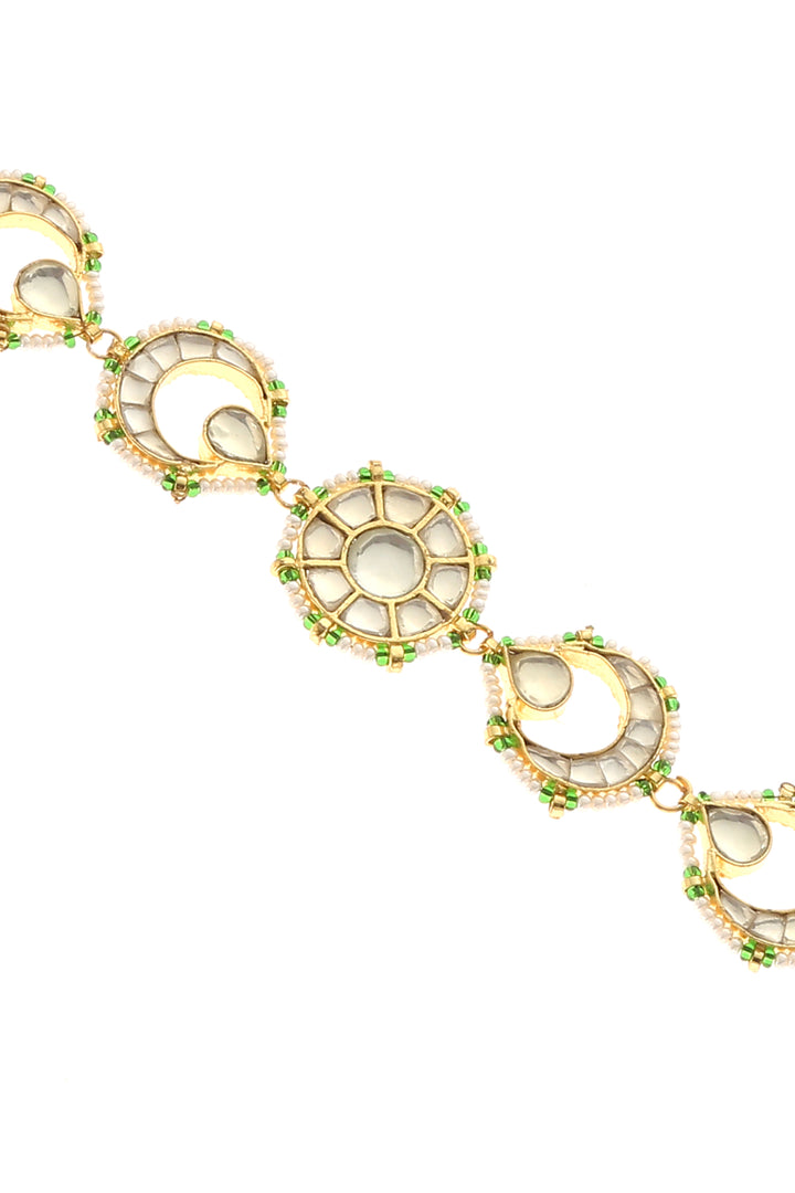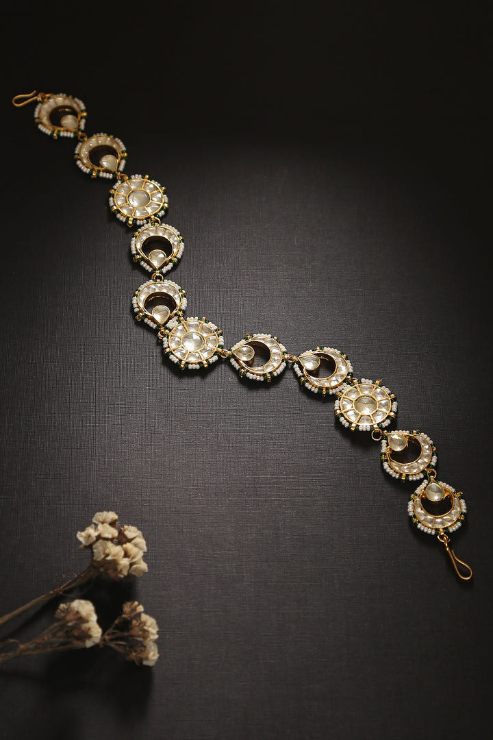 Kundan Sheeshphool Mathapatti is 22K Gold plated in paachi kundan setting. Its a dainty sheeshphool and can be worn by the bride's maid on the wedding