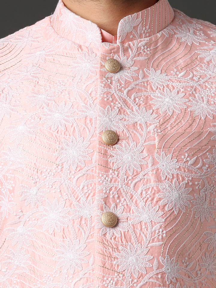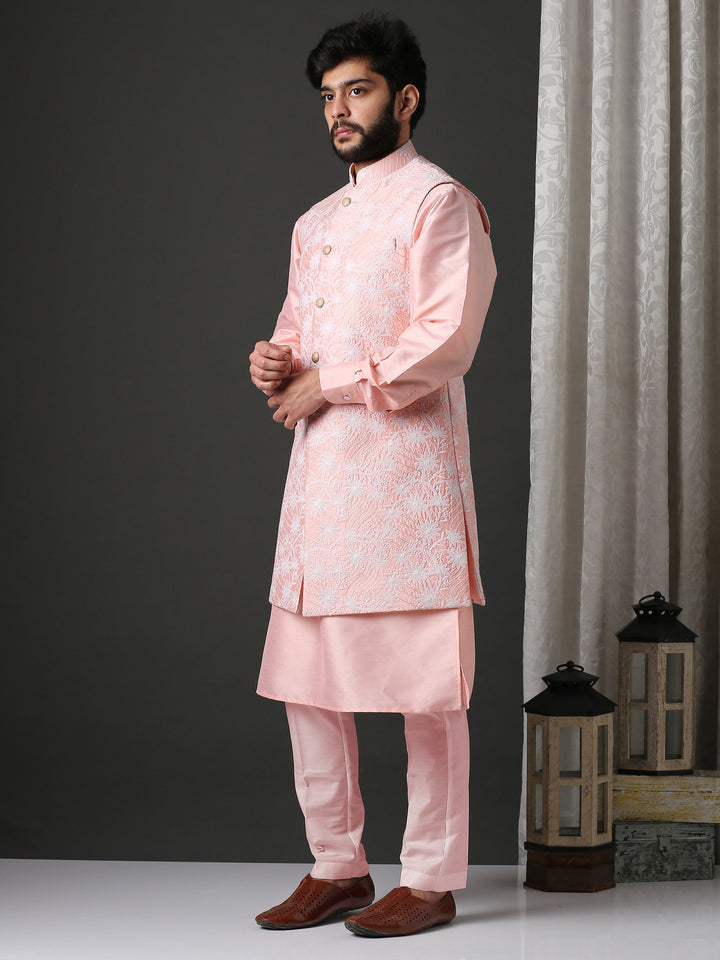 Components 3 Long Embroidered Nehru Jacket Sleeveless Neckline Mandarin Collar Full Front Button Placket Luxurious Poly Silk Pant Kurta Regular Fit Fresh and Soothing yet understated look Sophisticated Styling Must Have For All Wardrobes
