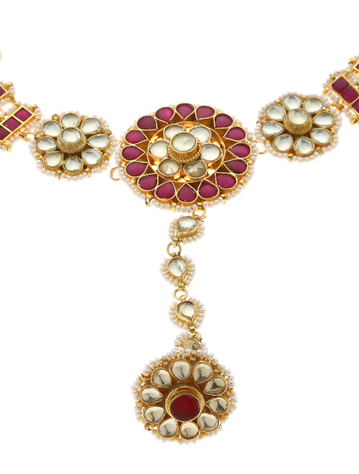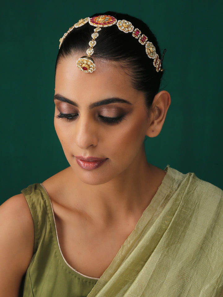 Kundan Sheeshphool with Borla is 22K Gold plated in paachi kundan setting embellished with colored kundan. It has a sheeshphool style matha patti with borla. It has a marwar style and can be worn by the bride and bride's family.