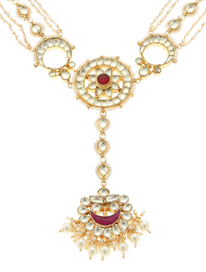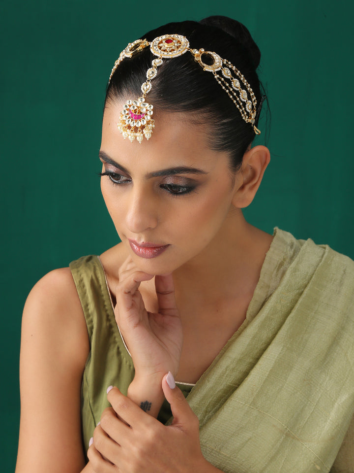 Kundan Sheeshphool Mathapatti is 22K Gold plated in paachi kundan setting embellished with colored kundan and pearls. It has a dainty sheeshphool with a teeka. It can worn by the bride and bride's maid.