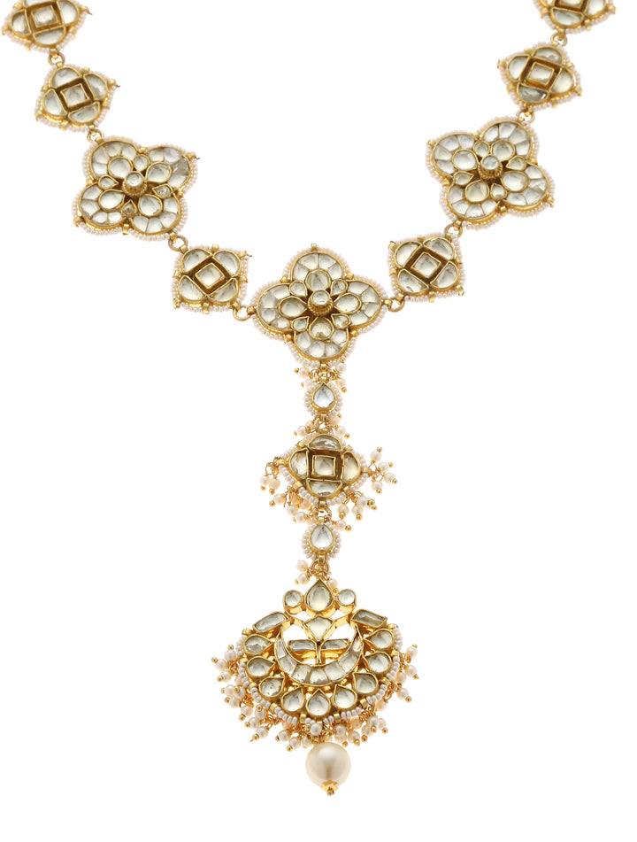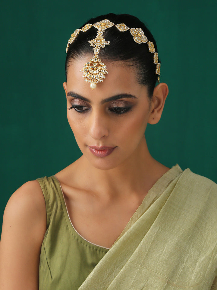 Floral Sheeshphool Teeka is 22K Gold plated in paachi kundan setting embellished with pearls. As the name suggests it has floral motifs in the sheehphool. It goes with all colors of costumes and can be worn by the bride and also bride's maid.