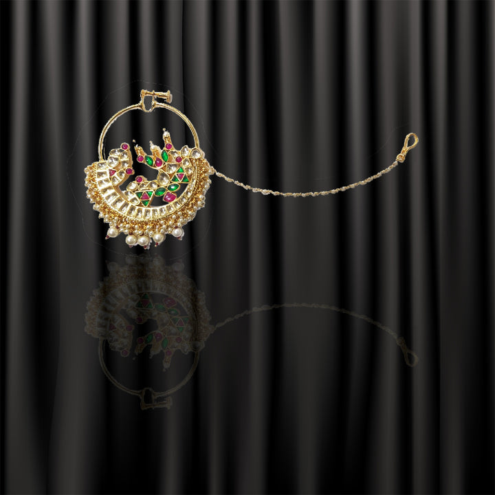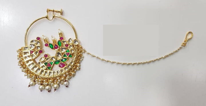 Marwar Nath is Gold plated in Pachi Kundan setting embellished with colored Kundan and Pearls. It has a screw and a chain and hook to support.
