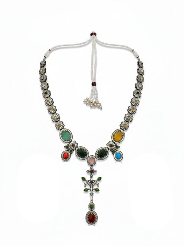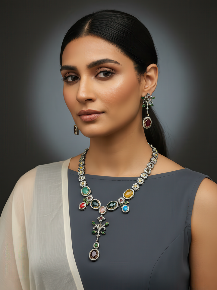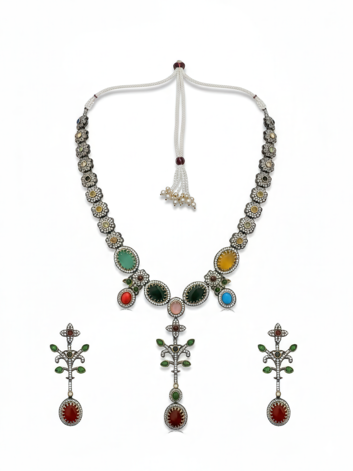 The Regal Symphony Set is symphony of colors and crystals in rhodium polish, this set blends royal grandeur with contemporary elegance, making it a versatile statement piece.