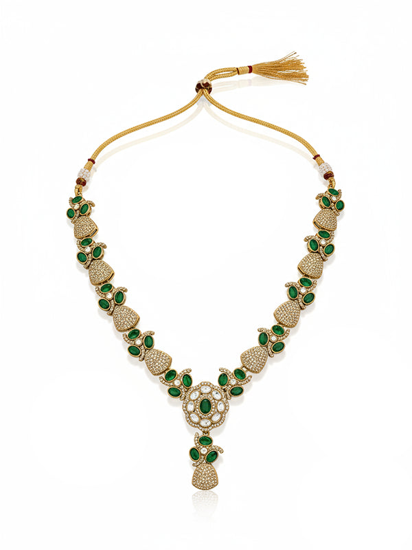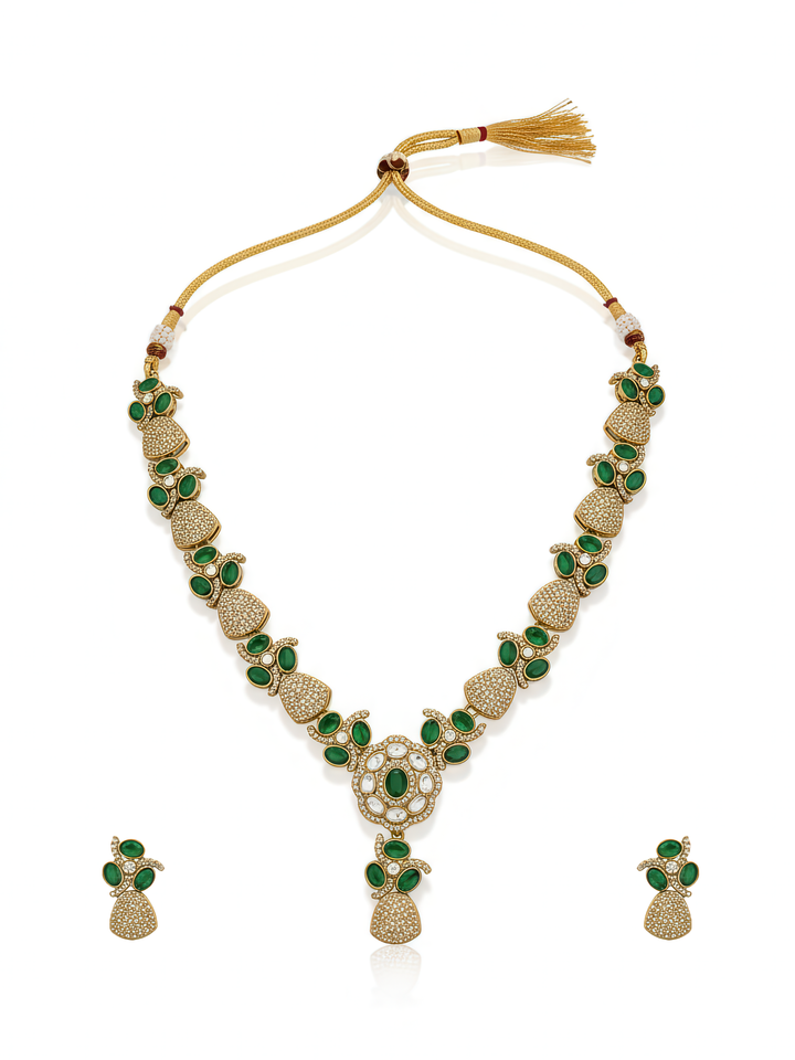 The Vasudha Set, inspired by the Sanskrit word for “Earth,” mirrors the lush abundance of nature. Adorned with shimmering crystals and emerald-colored stones, its gold plated finish adds a timeless radiance. Just as Vasudha nurtures life, this set embodies elegance, prosperity, and the beauty of evergreen charm.