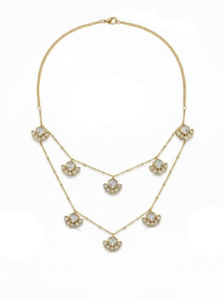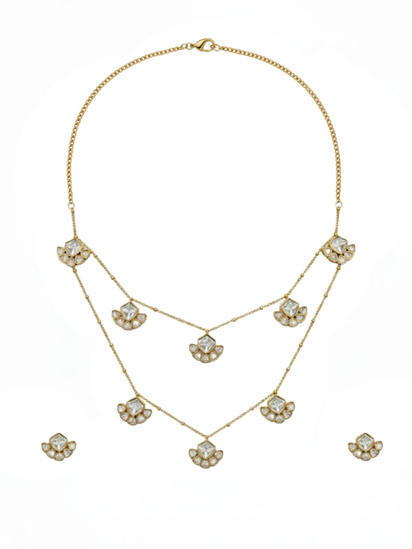 The Ekatra Set is a gold-plated masterpiece with a kundan/polki setting, designed with multiple cascading layers that symbolize coming together as one. Staying true to its name, Ekatra—“together”—this layered design beautifully blends Indian artistry with a modern Indo-Western aesthetic, making it perfect for contemporary celebrations.