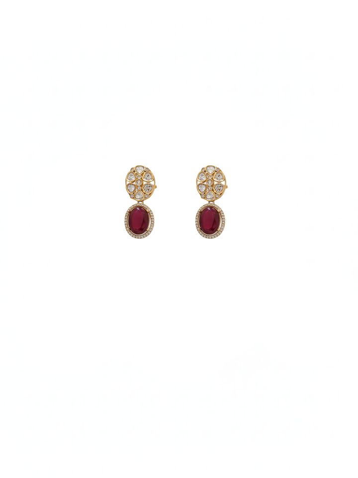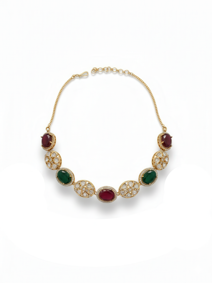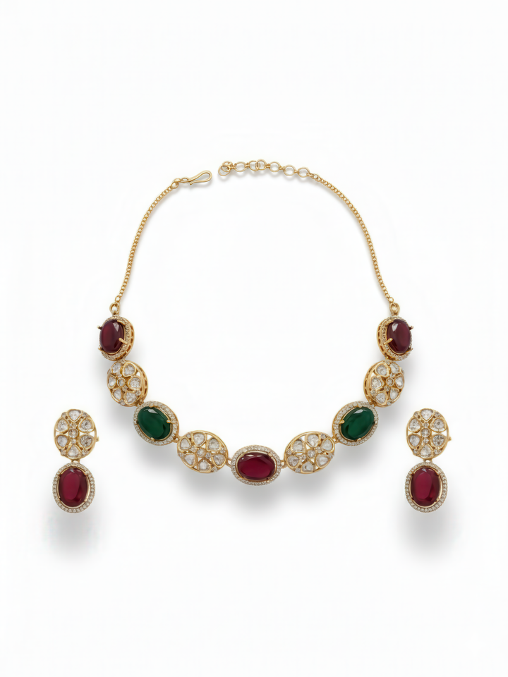 The Ruhani Set is a gold-plated kundan/polki creation adorned with striking red and green stones, radiating depth and timeless allure. True to its name Ruhani—meaning “soulful”—this set embodies a spirit of grace and devotion, making it the perfect companion for festive and wedding celebrations.