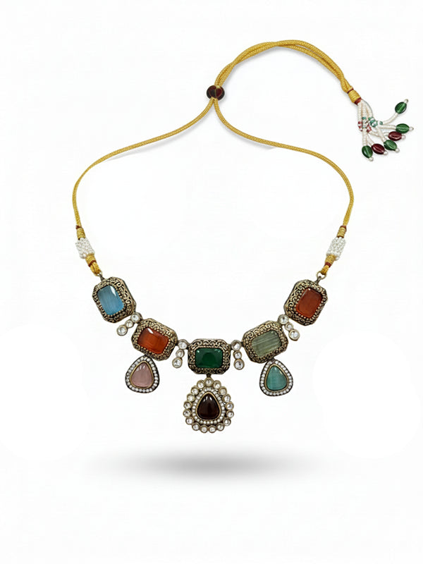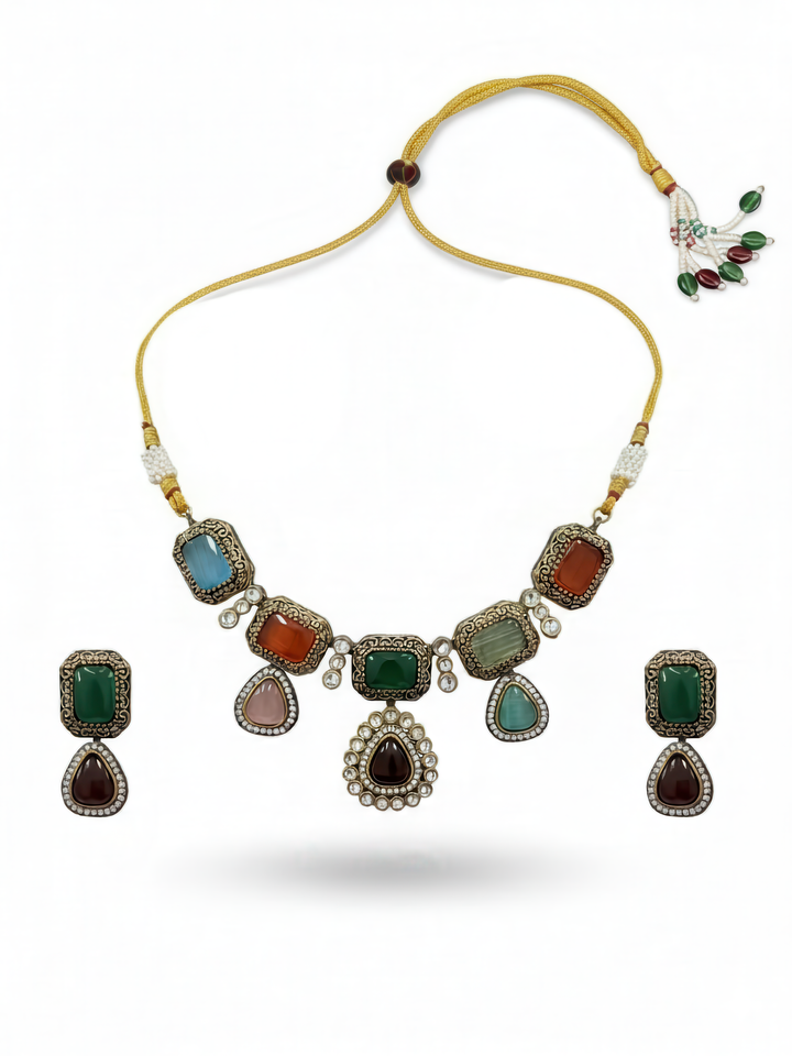 The Rangmanch Royale Set celebrates the vibrance of life, much like a grand stage where every hue tells a story. Crafted in rhodium polish and adorned with crystals and multi-coloured stones, this set resonates with its name—bringing drama, festivity, and royal elegance to every occasion.