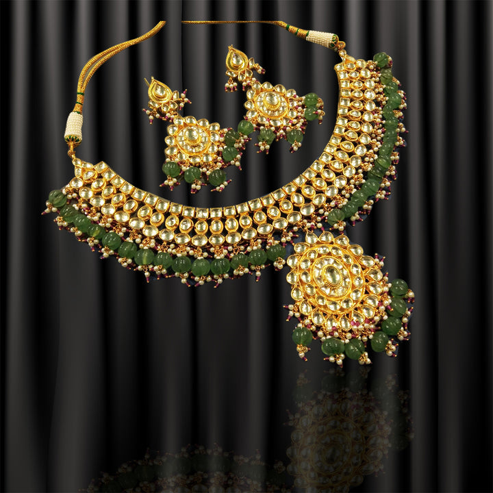 Milan Kundan Set is from the Gehna Collection. It is 22K gold plated in paachi kundan setting. It is a very traditional set handcrafted in antique finish and is embellished with pearls and aventurine green beads. The set comes with a neckline necklace with a pendant and matching earrings. It is best suited for the bride on her wedding day.