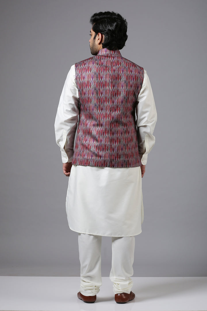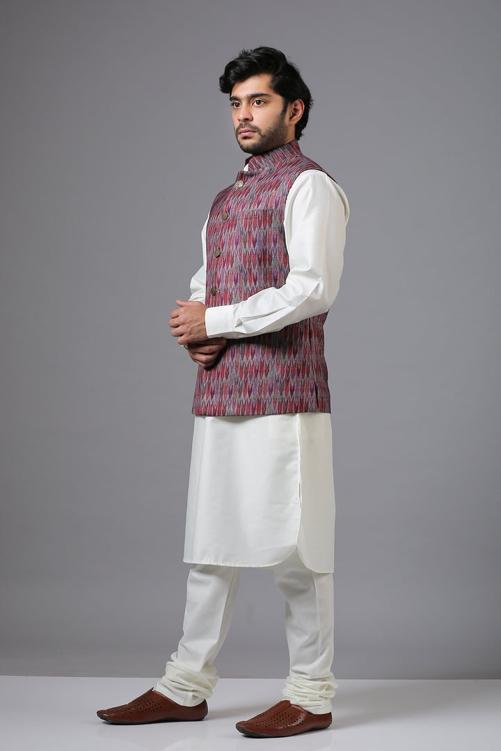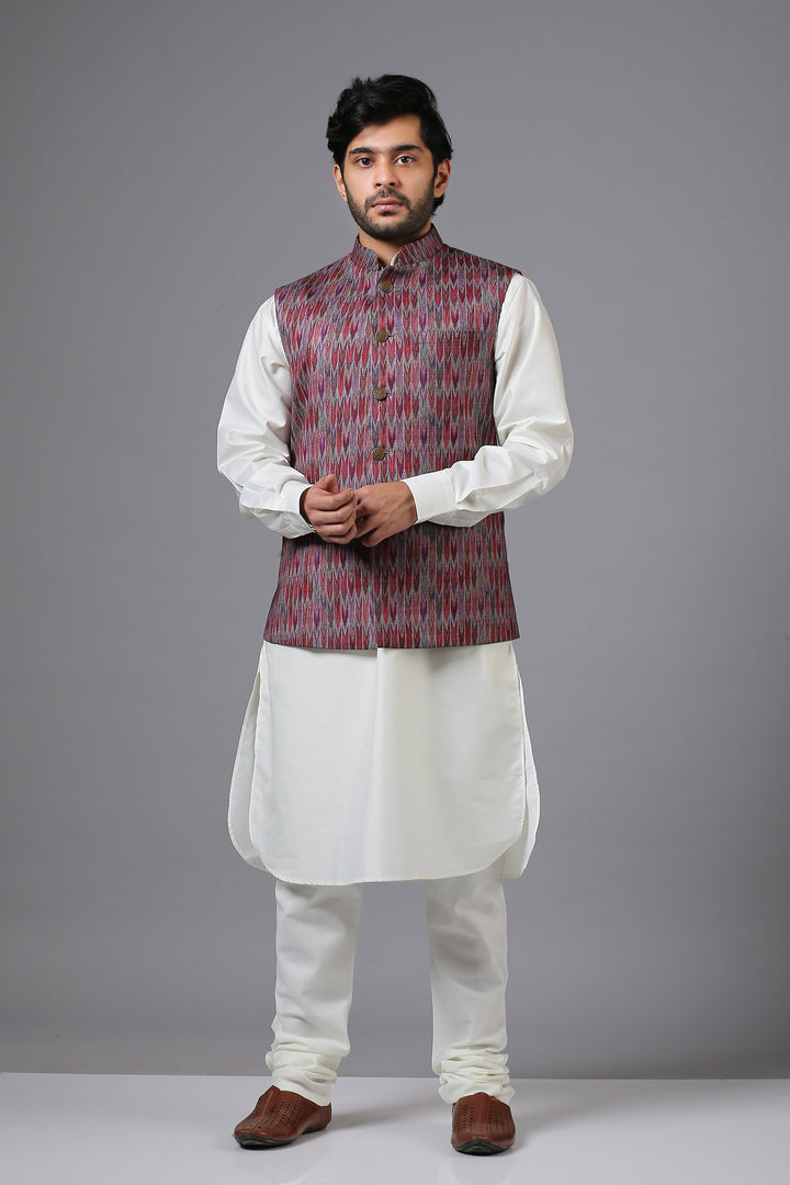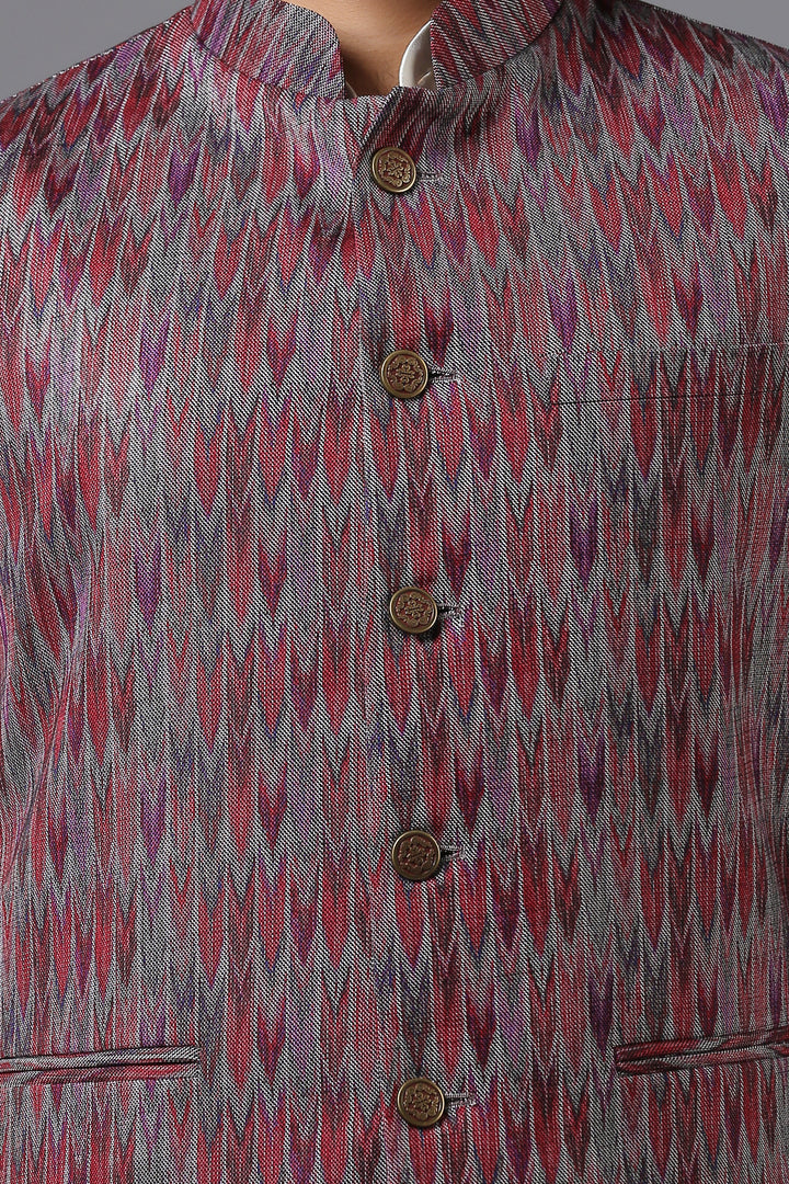 Components: 1 Material: Poly Silk Primary Color: Maroon Printed Woven Bundi Sleeveless Neckline Mandarin Collar Front Button Placket Regular Fit Festive Look