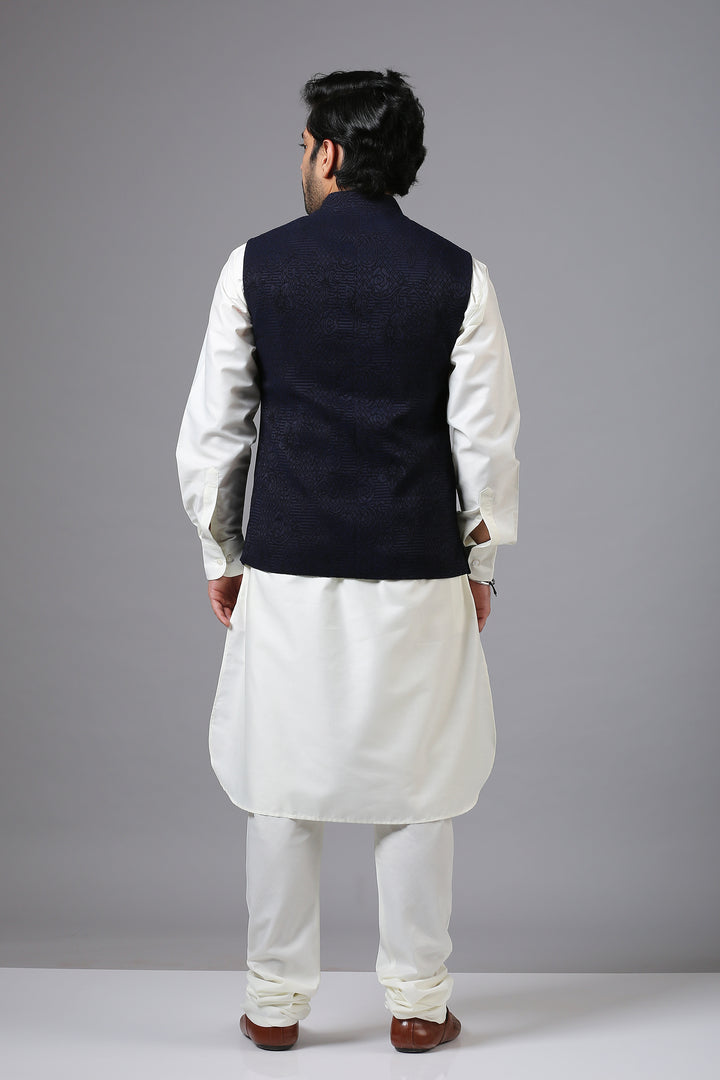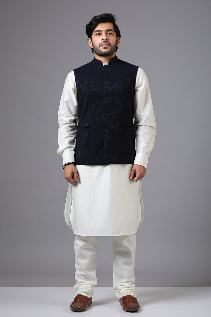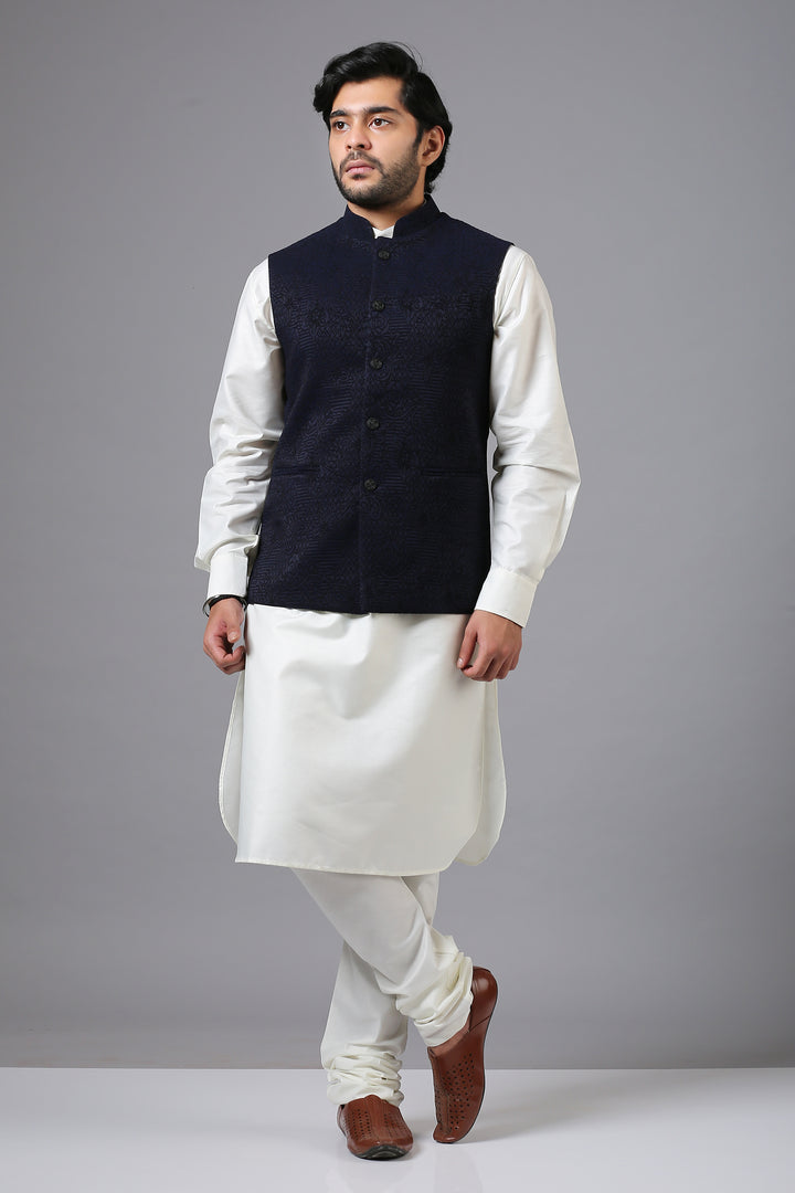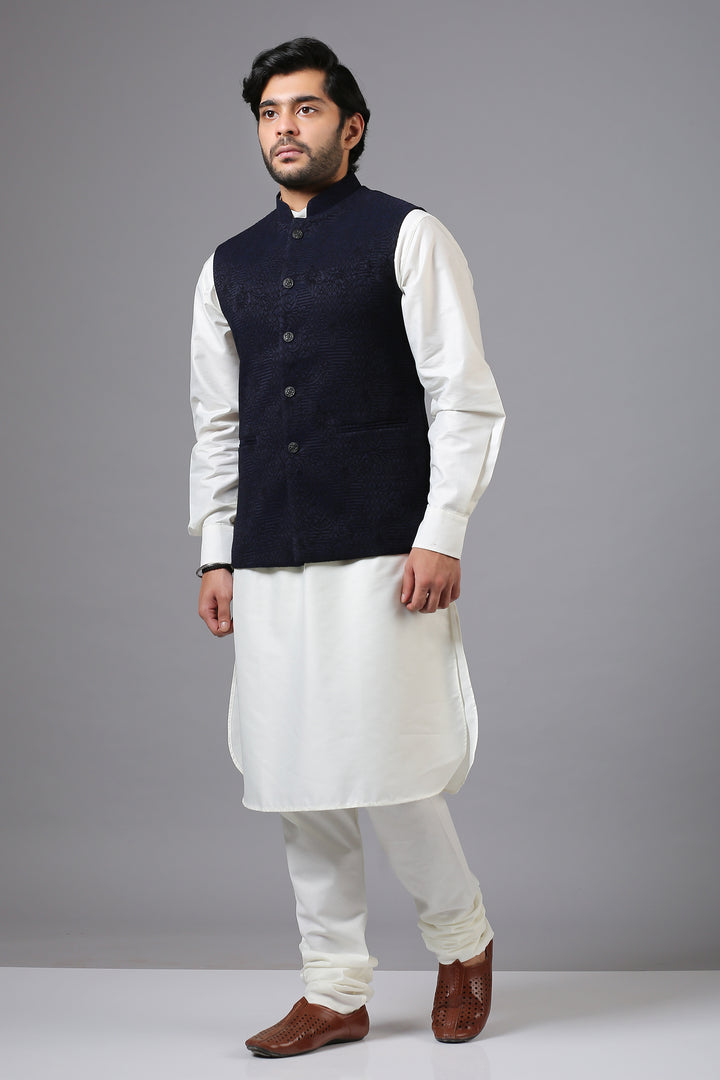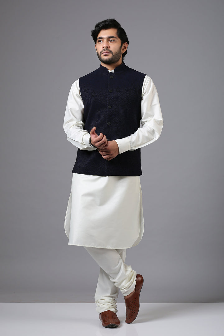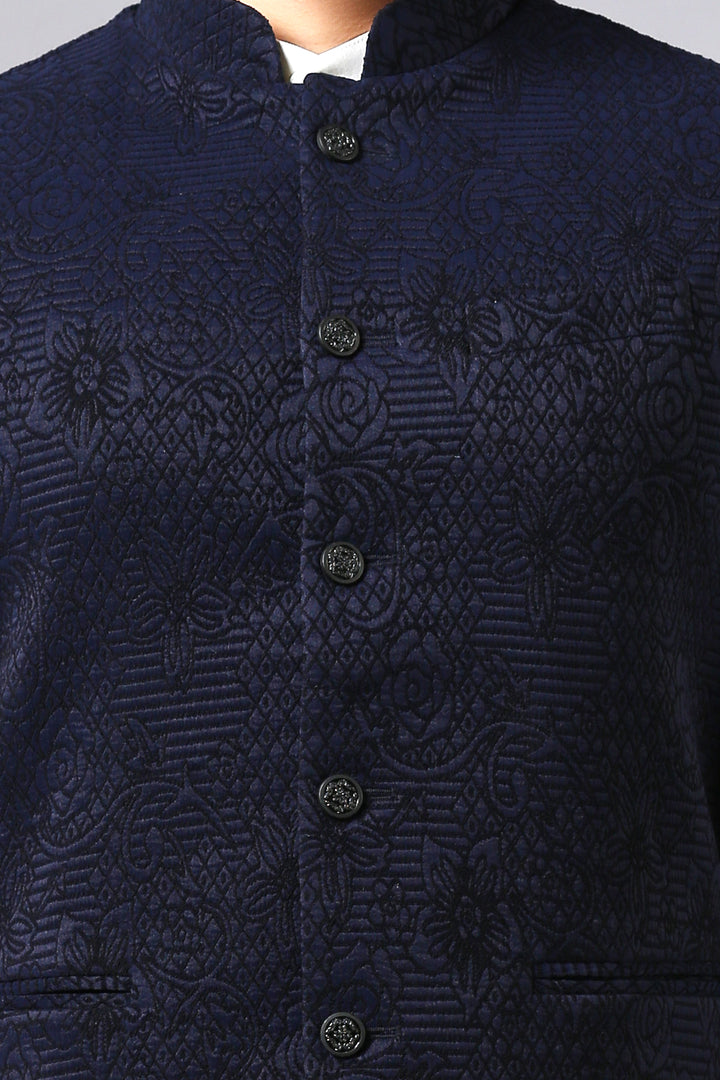 Components: 1 Material: Poly Silk Primary Color: Navy Printed Woven Bundi Sleeveless Neckline Mandarin Collar Front Button Placket Regular Fit Festive Look