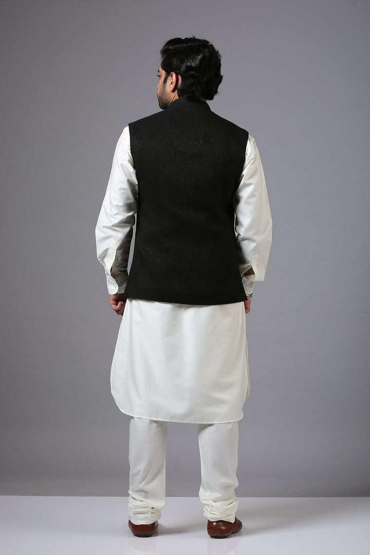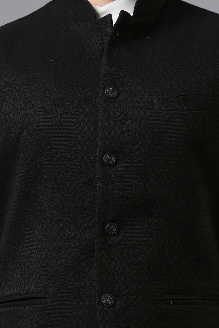 Components: 1 Material: Poly Silk Primary Color: Black Embroidered Woven Bundi Sleeveless Neckline Mandarin Collar Front Button Placket Regular Fit Festive Look