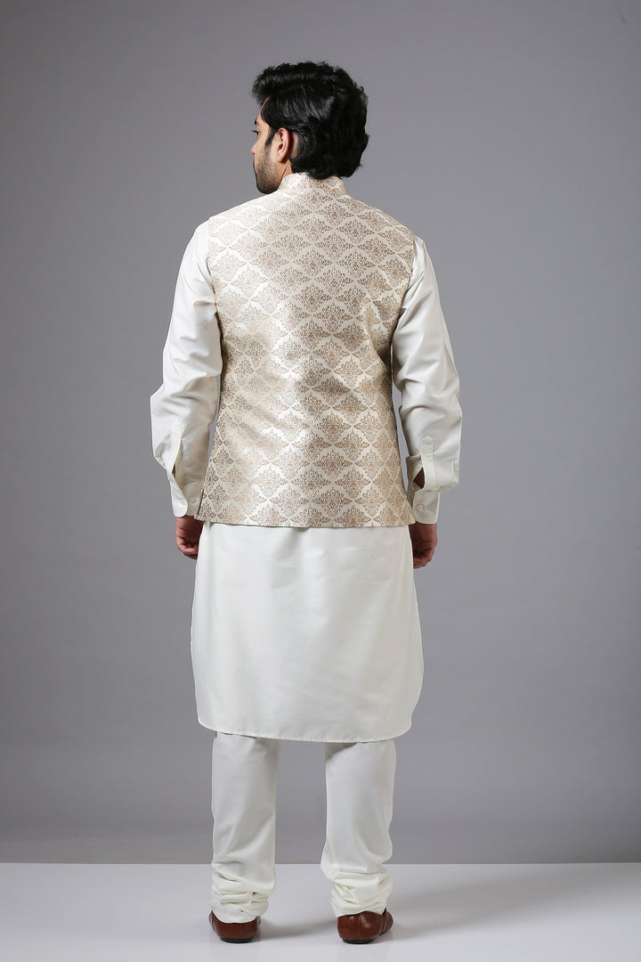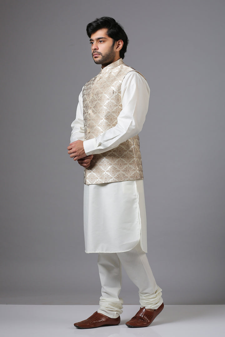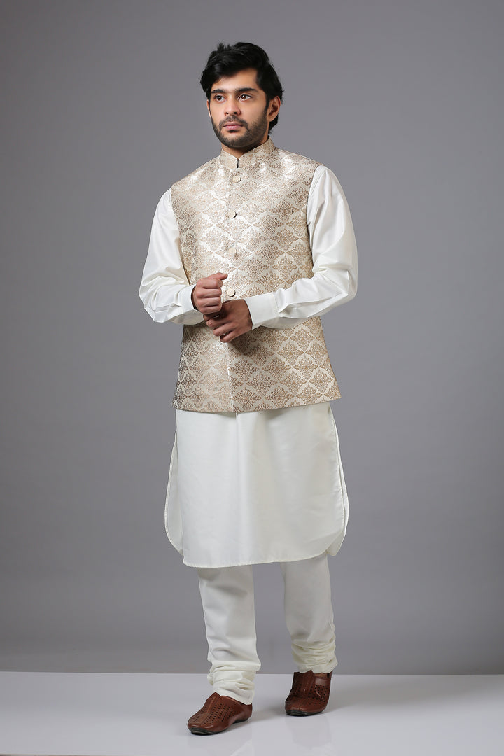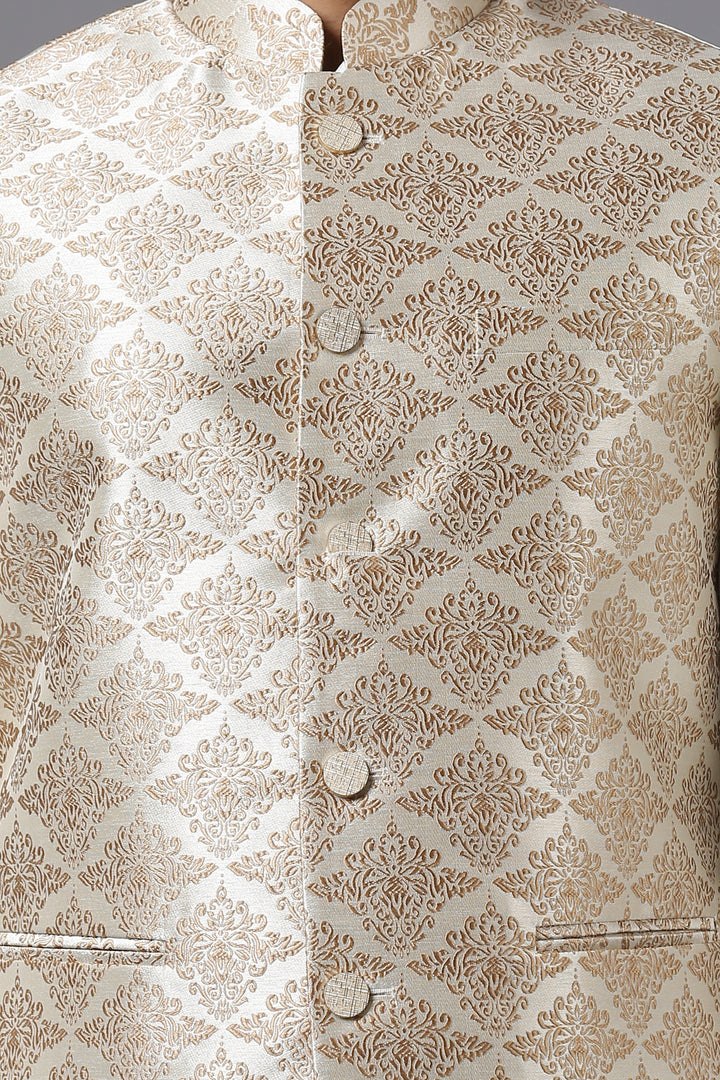 Components: 1 Material: Poly Silk Primary Color: Fawn Embroidered Woven Bundi Sleeveless Neckline Mandarin Collar Front Button Placket Regular Fit Festive Look