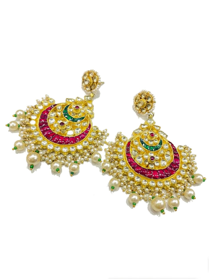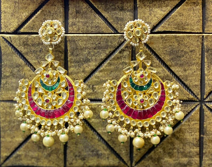 Ruby and Emerald Enameled Chandbalis with Golden Balls are 22K Gold plated in Paachi Kundan setting. These are embellished with Pearls and are perfect piece of jewelry for any festival and function.