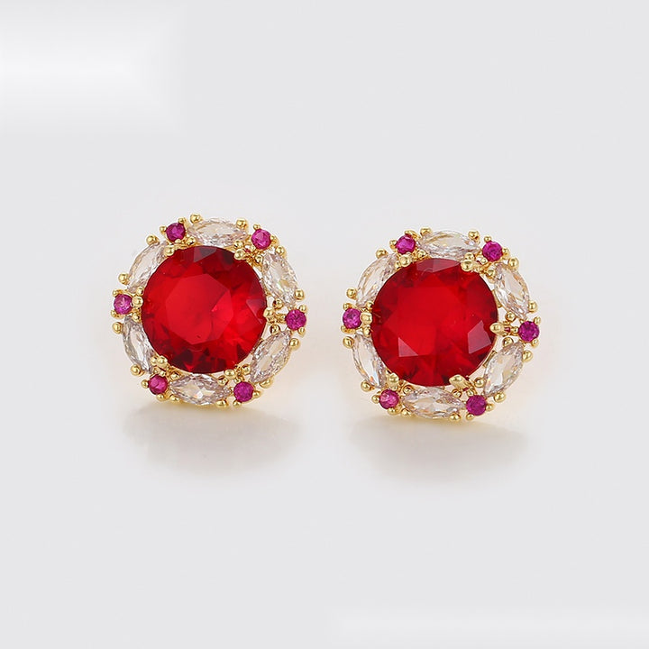 These stunning stud earrings feature a round, textured Ruby center stone, surrounded by a halo of sparkling clear marquise-cut stones and delicate small Ruby gemstones. Set in gold-tone metal, these earrings exude elegance and femininity, making them a perfect statement accessory. Stud post-back for secure and comfortable wear Suitable for parties, weddings, casual outings, or formal events.