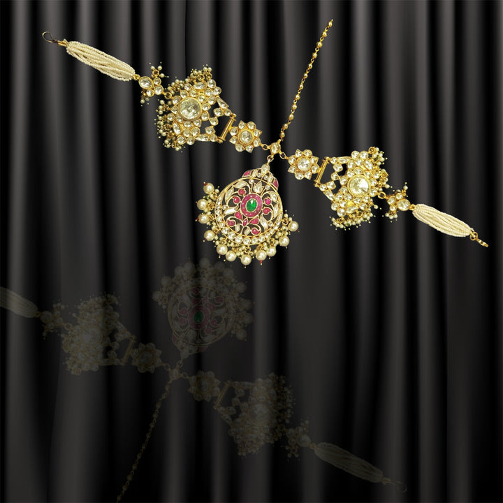Sheeshfool -Mathapatti is 22K Gold plated in Paachi Kundan with Teeka. It is embellished with pearls. This sheeshphool style mathapatti can be worn by the bride and the bride's maid. It has two variants, one in antique finish white kundan and another in antique finish colored kundan.