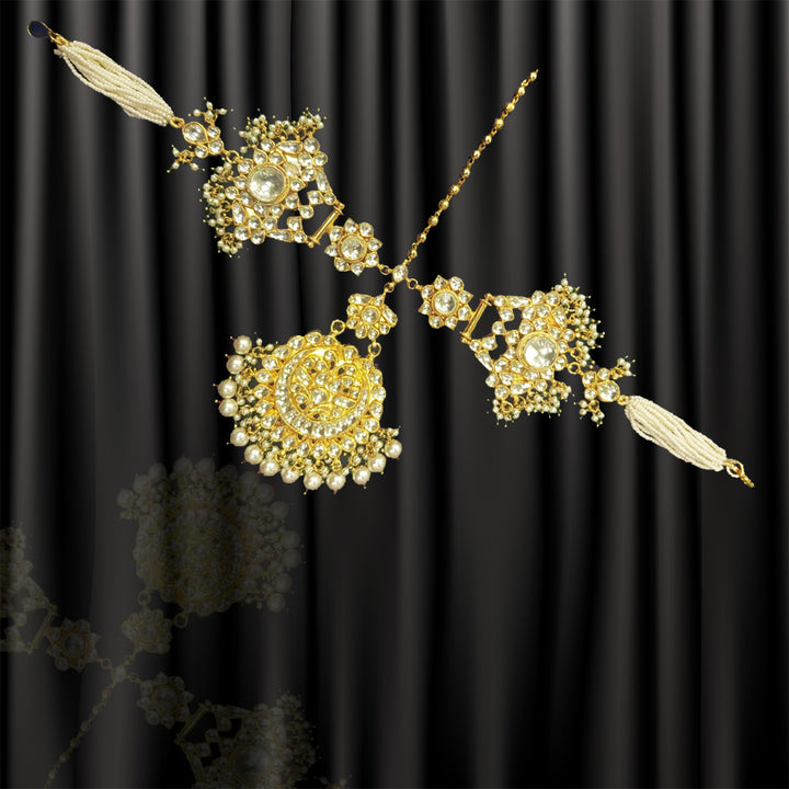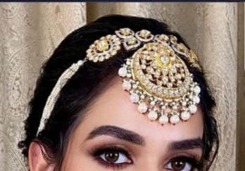 Sheeshfool -Mathapatti is 22K Gold plated in Paachi Kundan with Teeka. It is embellished with pearls. This sheeshphool style mathapatti can be worn by the bride and the bride's maid.