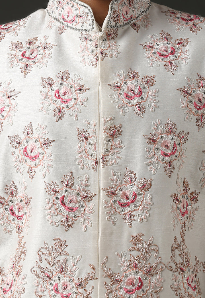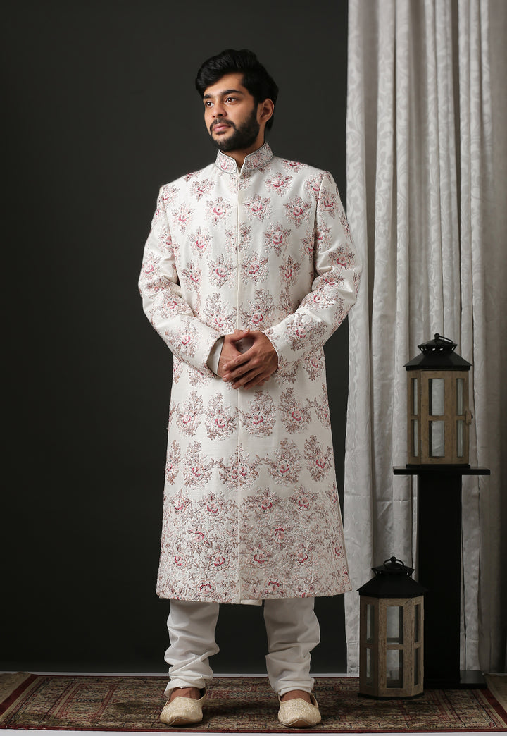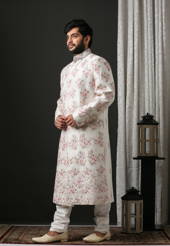 Elegant Off White all-over graded hand embroidery with Maroon and greyish color combination, a perfect outfit for your special day. Paired with kurta and churidar set