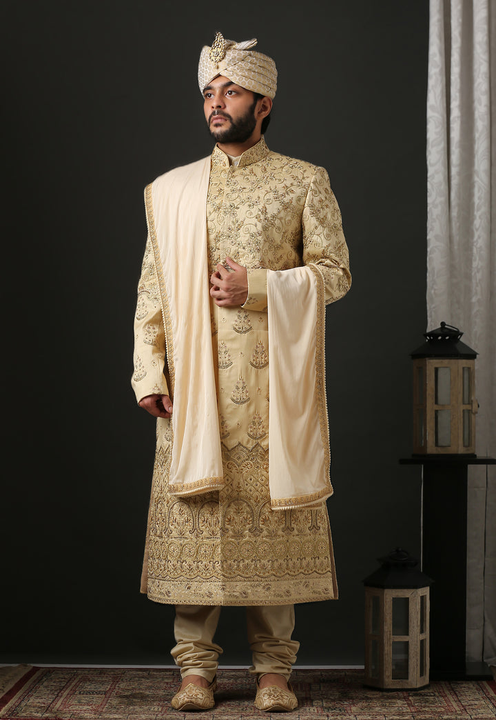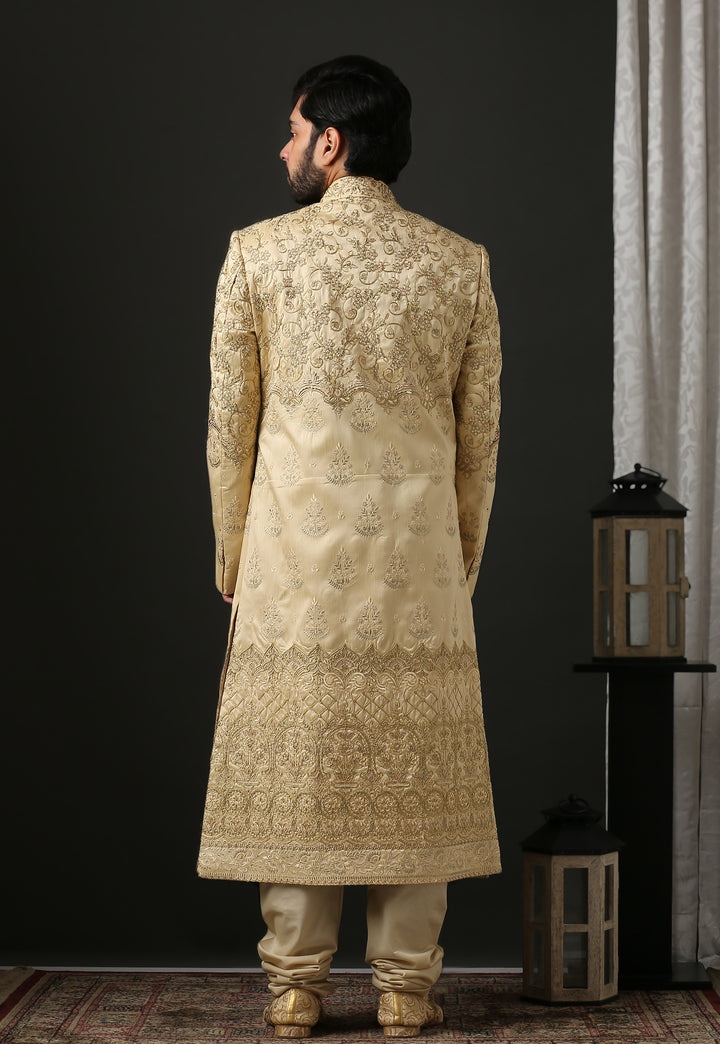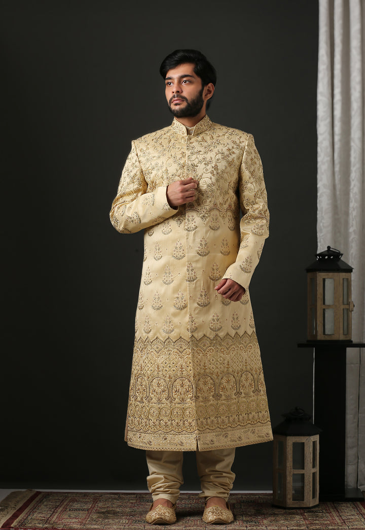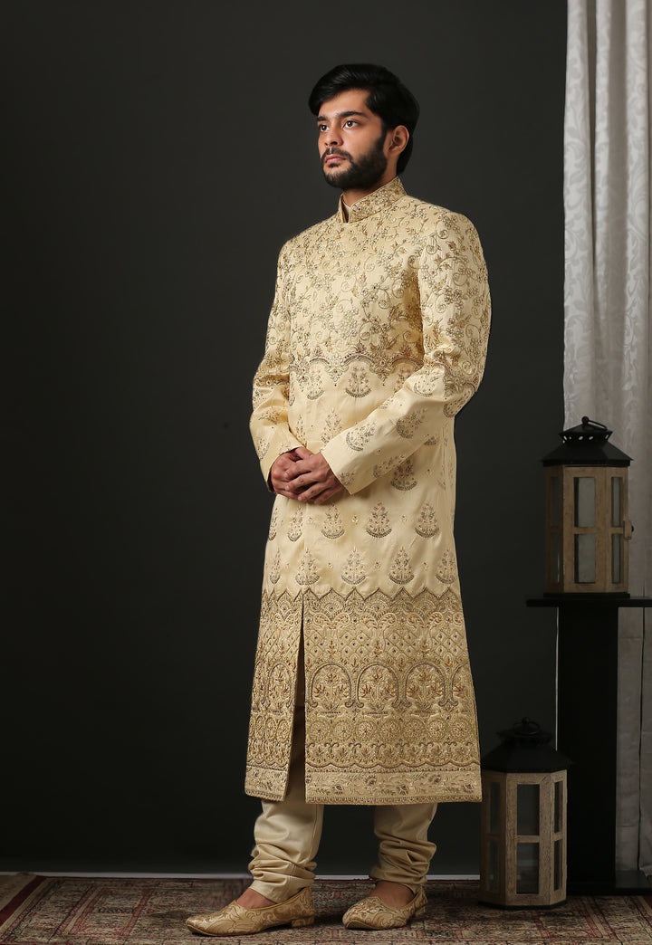 Royal Cream Sherwani with golden embroidery with intrinsic work around the hem giving a very contemporary look. Paired with churidar and kurta set Fabric: Luxurious Silk blend Components: Sherwani, Kurta with Churidar of your choice Primary Color: Golden Secondary Color: Gold Regular Fit Hand Embroidery