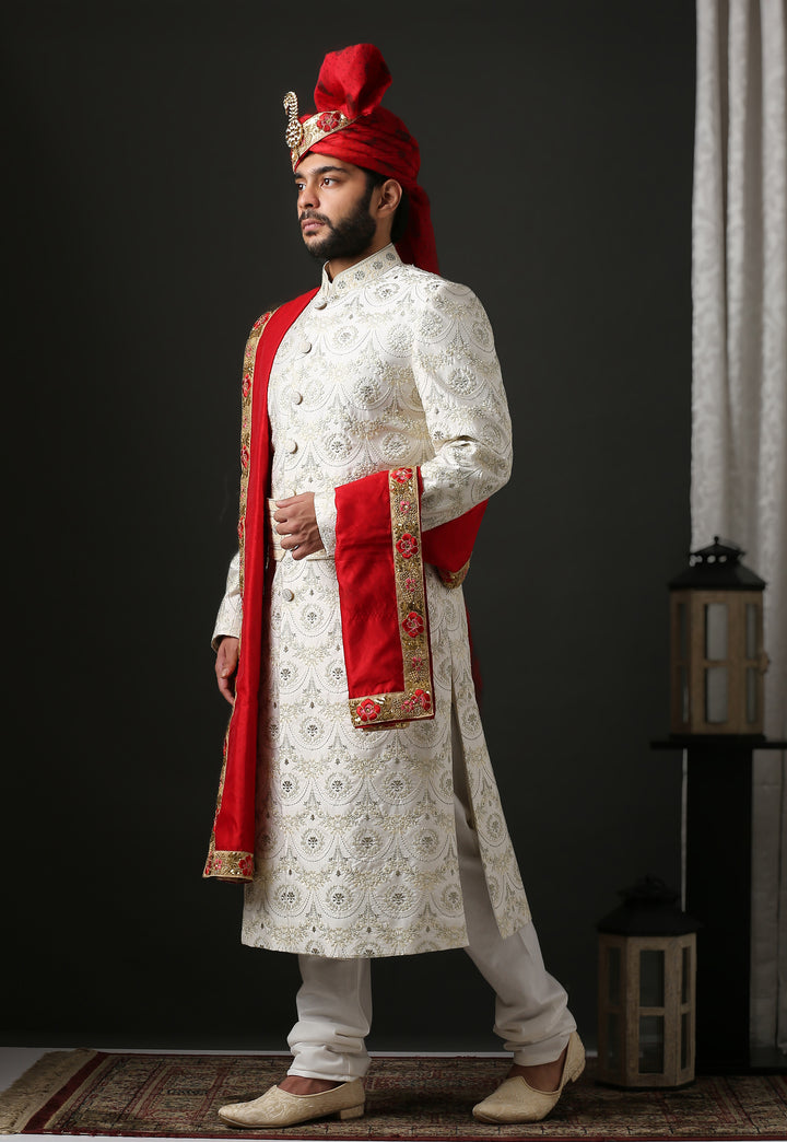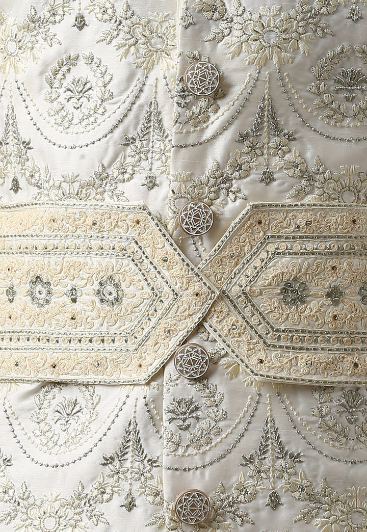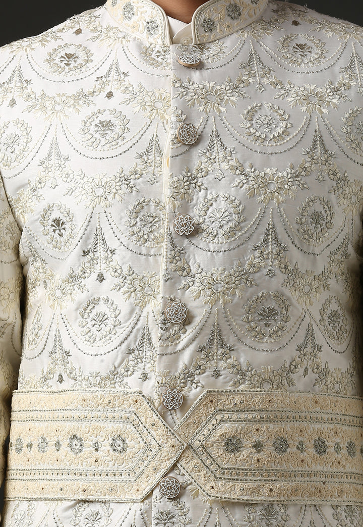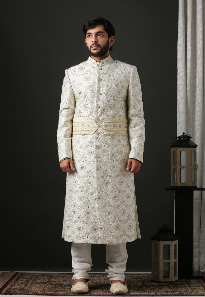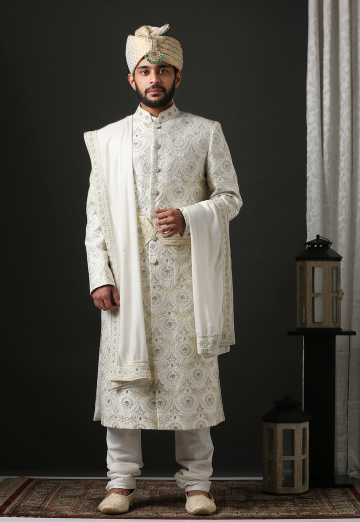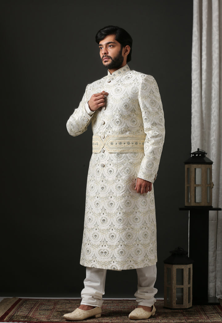 Elegant and understated white-colored stylish modern look Sherwani with all-over hand embroidery. Paired with a white churidar kurta set. Fabric: Luxurious Silk blend Components: Sherwani, Kurta with Churidar of your choice Primary Color: White Secondary Color: Grey Regular Fit Hand Embroidery Stylized Understated yet modern