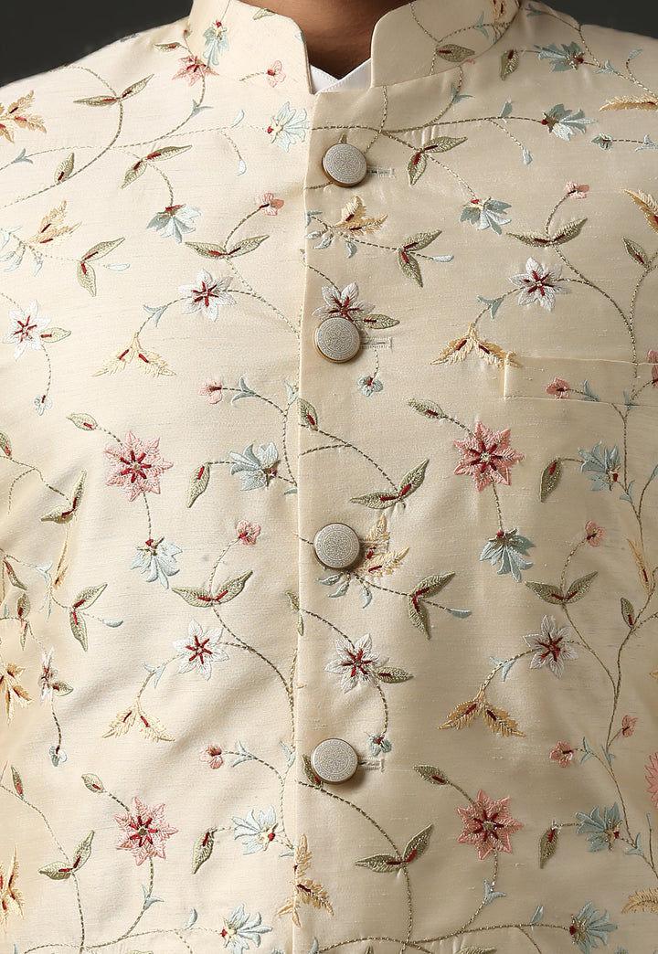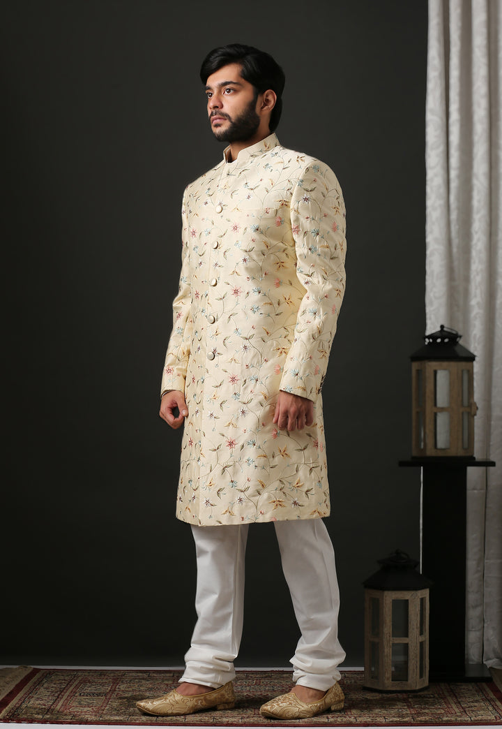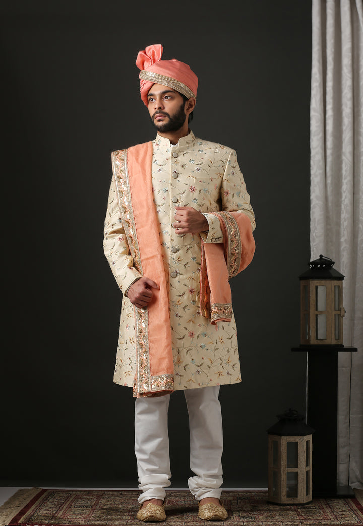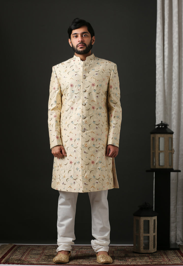 Contemporary Floral Embroidered Beige Sherwani