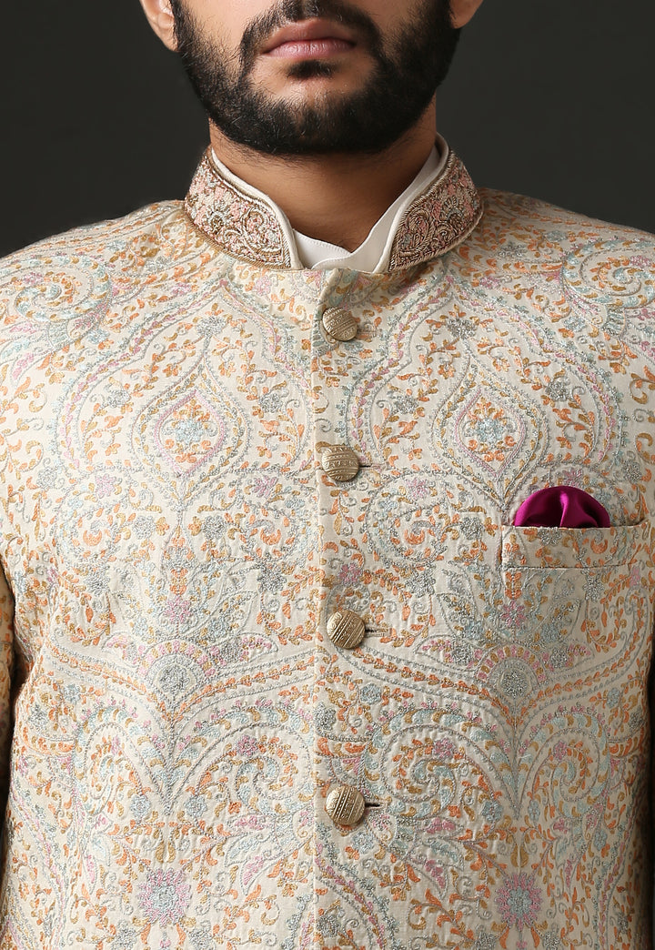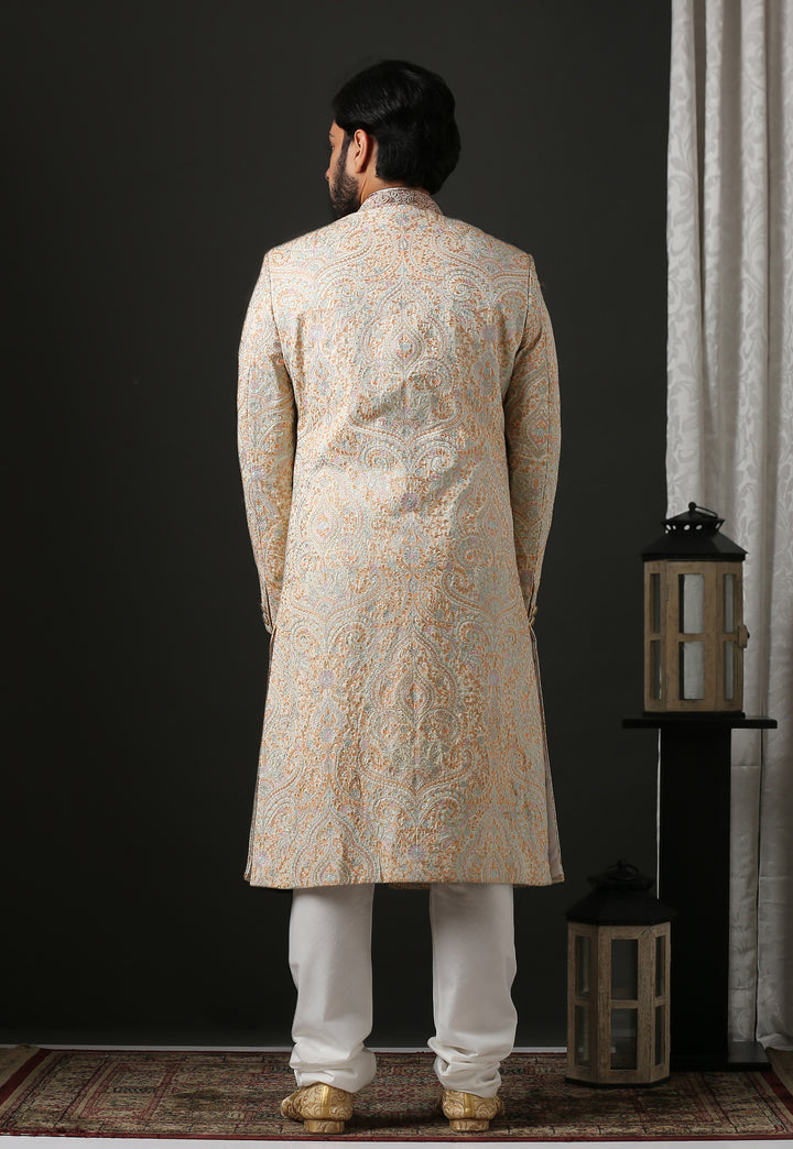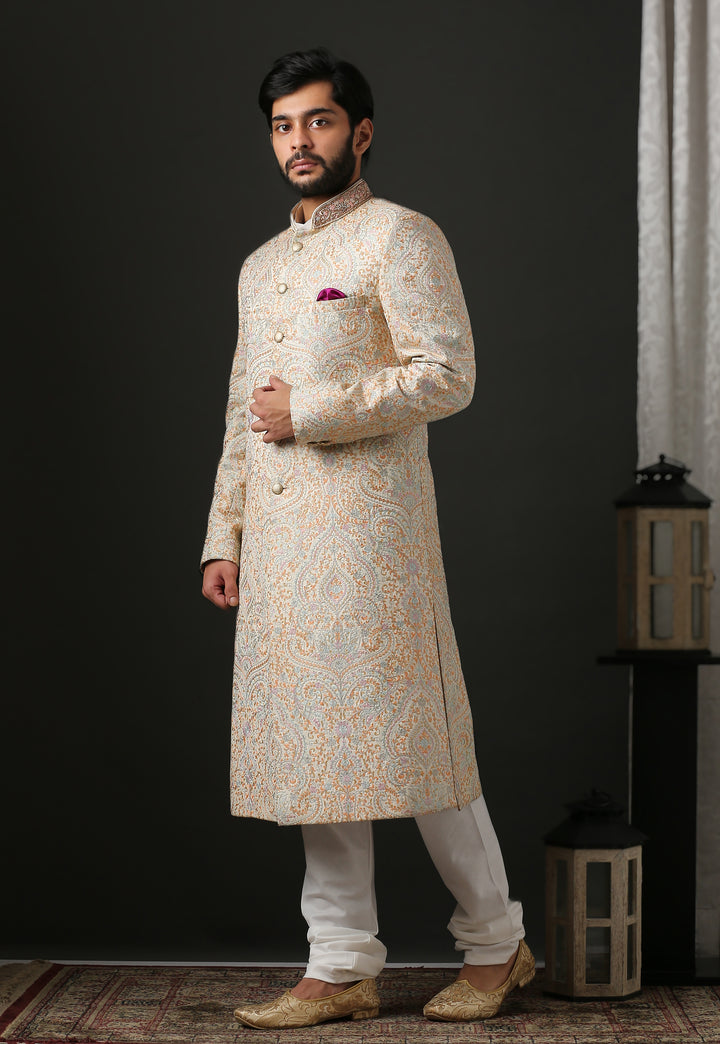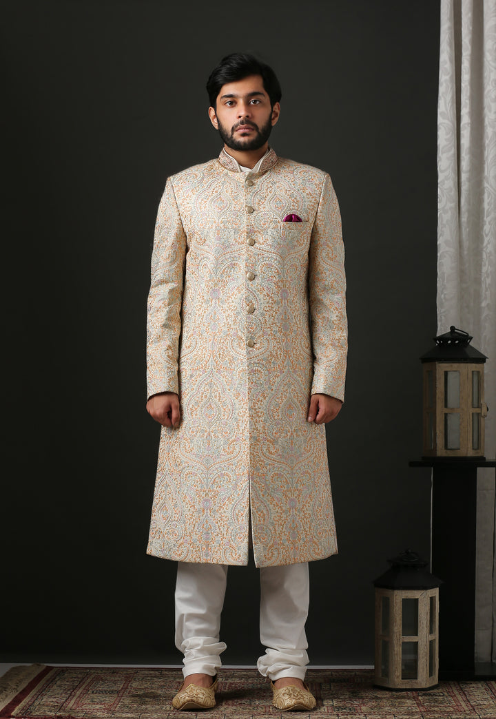 Elegant hand-embroidered Peach Sherwani for the Royal look paired with Kurta and Churidar set